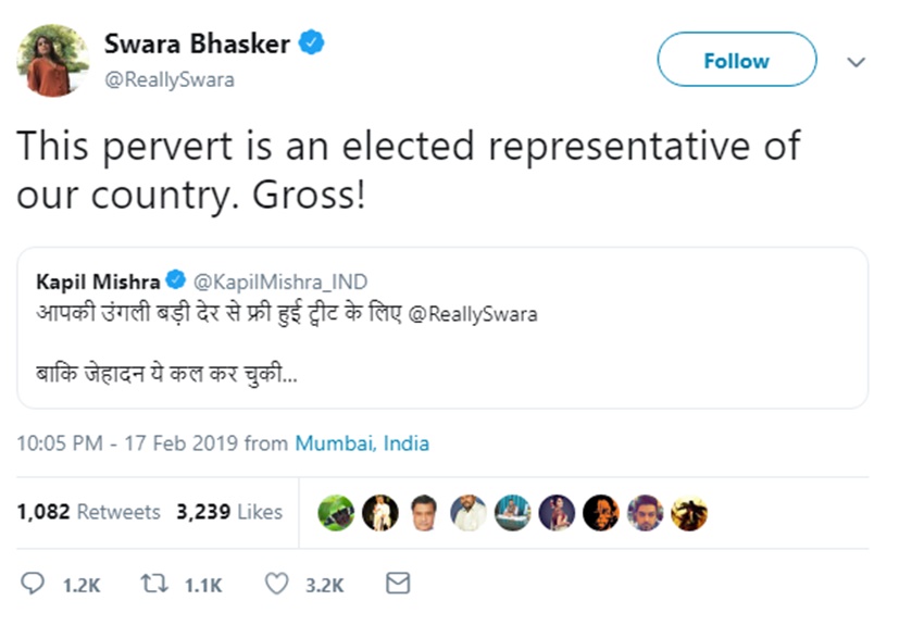 अभिनेत्री स्वरा भास्कर सोशल मीडिया पर काफी एक्टिव रहती हैं। अक्सर वो कई मुद्दों पर बड़ी ही बेबाकी से अपनी राय ट्विटर पर रखती भी हैं। हालांकि ट्विटर पर अपनी बातों को लेकर वो कई बार यूजर्स के निशाने पर भी आ चुकी हैं। इस बार ट्विटर पर स्वरा भास्कर भिड़ गई आम आदमी पार्टी के बागी विधायक कपिल मिश्रा से। दरअसल सबसे पहले आप विधायक कपिल मिश्रा ने पुलवामा आंतकी हमले को लेकर ट्वीट किया कि ‘बदला एक सर्जिकल स्ट्राइक से नहीं होगा। बदला उनके 40-50 सैनिक को मार कर नहीं होगा। बदला हो, जैसे इजरायल लेता है।’इसपर अभिनेत्री स्वरा भास्कर ने कपिल मिश्रा को ट्वीट करते हुए लिखा कि ‘इस ट्वीट के अंतिम वाक्य को नरसंहार कहते हैं।’