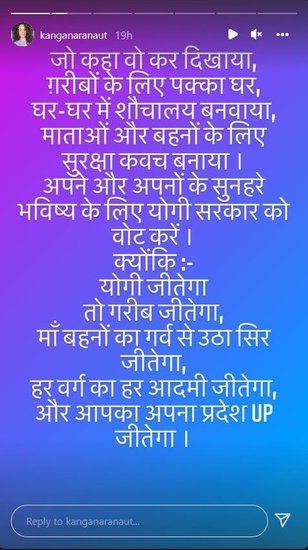 उत्तर प्रदेश चुनाव के तीसरे चरण से पहले भी कंगना ने इंस्टाग्राम पर लोगों से यूपी चुनाव में बीजेपी को वोट देने की अपील की है। कंगना ने वोट मांगते हुए कहा, ‘जो कहा वो कर दिखाया, गरीबों के लिए पक्का घर, घर-घर में शौचालय बनवाया, माताओं और बहनों के लिए सुरक्षा कवच बनाया। अपने और अपने के सुनहरे भविष्य के लिए योगी सरकार को वोट करें।’