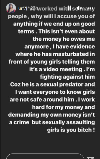 उर्फी का कहना है कि ”मैं उसके खिलाफ लड़ रही हूं, क्योंकि वो सेक्सुअल दरिंदा है। मैं पैसे कमाने के लिए इतनी मेहनत करती हूं और अगर अपने पैसे मांग लिए तो ये कोई जुर्म नहीं है, लेकिन लड़कियों को सेक्सुअली टॉर्चर करना क्राइम है।” उर्फी ने लिखा कि लड़कियां इस आदमी के आसपास सुरक्षित नहीं हैं।