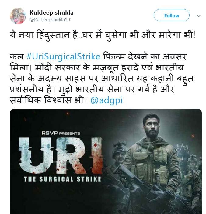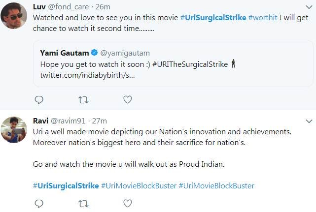 विक्की कौशल की फिल्म उरी को देखने के लिए लोग परिवार समेत सिनेमाघरों का रुख कर रहे हैं। फिल्म को देखने के बाद लोगों ने अपनी प्रतिक्रिया भी सोशल मीडिया पर जाहिर की है। एक ट्विटर यूजर ने लिखा- फिल्म को शनिवार की रात देखने के बाद वीकेंड बन गया।