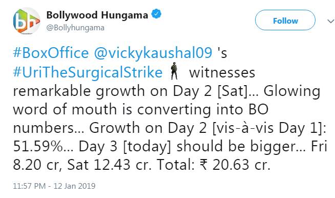 #2019 begins with a bang… #UriTheSurgicalStrike embarks on a flying start… Should witness growth on Day 2 and Day 3… Fri ₹ 8.20 cr. India biz. #Uri