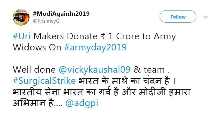 विक्की कौशल की फिल्म उरी बॉक्स ऑफिस पर अच्छा प्रदर्शन कर रही है। वहीं देशभक्ति पर आधारित फिल्म उरी के मेकर्स ने आर्मी डे पर 1 करोड़ रुपए का दान दिया है।