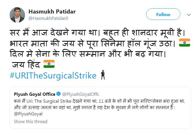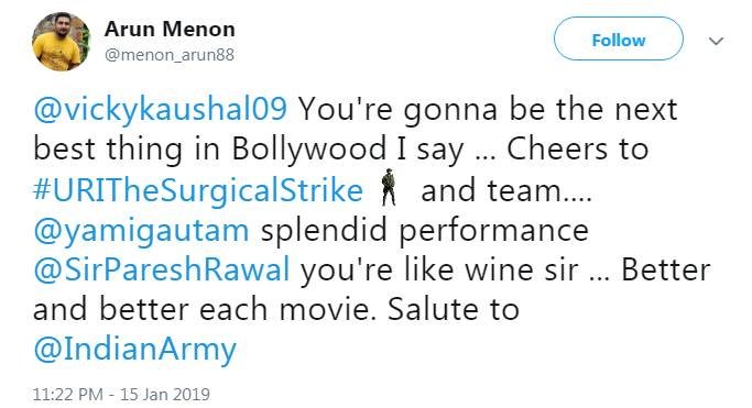 उरी फिल्म को देखने के बाद एक ट्विटर यूजर ने लिखा- साल 2019 की इससे अच्छी शुरुआत नहीं हो सकती है। यदि आपने इस फिल्म को अभी तक नहीं देखा हो तो फिल्म देखने के लिए आज ही सिनेमाघर जाएं।