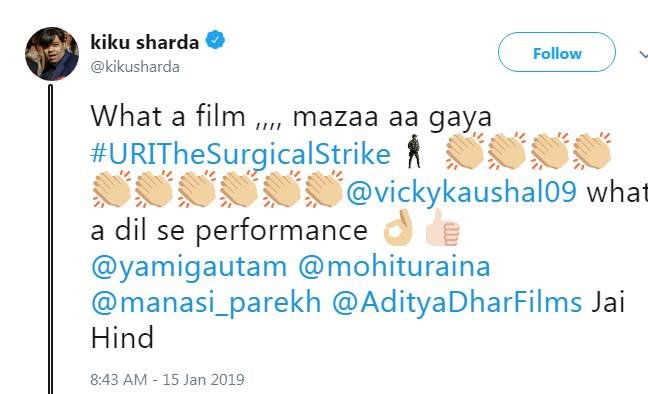 विक्की कौशल की फिल्म उरी को दर्शक खूब पसंद कर रहे हैं तो वहीं फिल्म को सेलिब्रिटीज भी पसंद कर रहे हैं। कॉमेडियन कीकू शारदा ने भी उरी फिल्म की तारीफ की है।