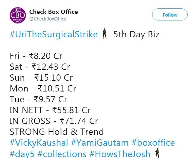 #UriTheSurgicalStrike is unshakable… Excellent on Day 4… Higher than Day 1… Will cross ₹ 50 cr today… Trending better than #Raazi, #Stree and #BadhaaiHo… Fri 8.20 cr, Sat 12.43 cr, Sun 15.10 cr, Mon 10.51 cr. Total: ₹ 46.24 cr. India biz. #Uri #HowsTheJosh