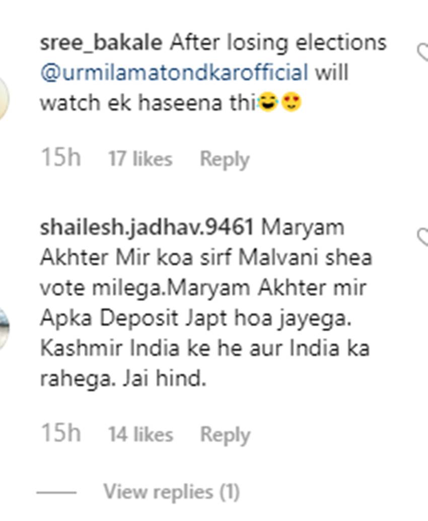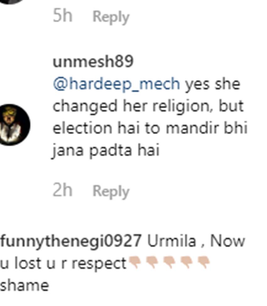 बता दें, एक्ट्रेस उर्मिला ने खुद से 9 साल छोटे कश्मीरी मुस्लिम युवा से शादी की है। मोहसीन अख्तर मीर उर्मिला के पति हैं, जो बॉलीवुड में अपना लक आजमा चुके हैं। उन्होंने इंडस्ट्री में कई मॉडलिंग असाइंमेंट्स और फिल्में भी कीं। इसके बाद उर्मिला और मोहसीन की मुलाकात हुई और प्यार में बदल गई। उर्मिला और मोहसीन का निकाह हुआ और एक्ट्रेस ने इस्लाम धर्म कबूल कर लिया था। शादी के बाद एक्ट्रेस ने अपना नाम मरियम अख्तर मीर रखा। ऐसे में उर्मिला को ट्रोल्स सोशल मीडिया पर इसी नाम को बोल कर ट्रोल कर रहे हैं।