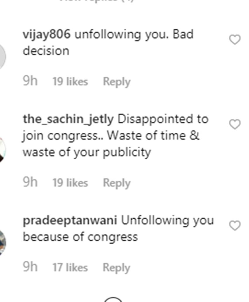 इस बीच एक्ट्रेस ने अपनी एक तस्वीर सोशल मीडिया पर शेयर की। तस्वीर में एक्ट्रेस कांग्रेस के रंग में रंगी नजर आ रही हैं। वहीं एक्ट्रेस मंदिर में बैठी दिखाई दे रही हैं। इस तस्वीर को शेयर करते हुए एक्ट्रेस ने लिखा-‘अब मैं बहुत बहादुर हो चुकी हूं, बिना किसी पछतावे के मैं जो हूं खुद को वैसे एक्सेप्ट करती हूं। भगवान का आशीर्वाद है। इज्जत है और ढेर सारा प्यार है।’ इस तस्वीर को देखने के बाद यूजर्स ने इस पर कमेंट करना शुरू कर दिया। यहां देखें कमेंट्स:-