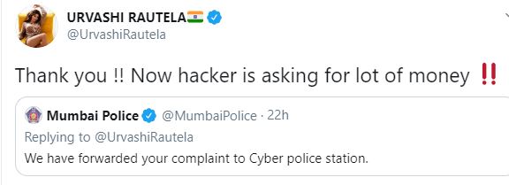 बॉलीवुड अभिनेत्री उर्वशी रौतेला का शनिवार को ट्विटर अकाउंट हैक होने की खबर सामने आई। एक्ट्रेस एक ट्विटर पोस्ट के जरिए खुद इस बात की जानकारी दी कि उनका फेसबुक अकाउंट हैक हो गया है और इसकी जानकारी उन्होंने मुंबई पुलिस को देदी है। जिसके बाद मुंबई पुलिस ने ट्वीट करते हुए लिखा कि आपकी कंप्लेन को आगे साइबर पुलिस को बड़ा दिया गया है। उर्वशी का अकाउंट हैक करने के बाद हैकर्स ने उस पर कुछ अश्लील पोस्ट भी डाले थे और वो उर्वशी रौतेला से अच्छी खासी रकम की मांग कर रहे थे।