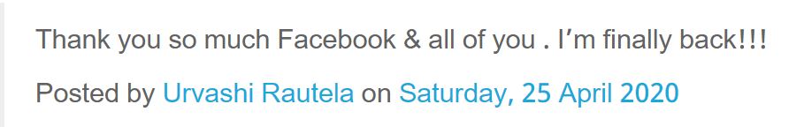 हालांकि जल्द ही उर्वशी रौतेला का अकाउंट रिकवर कर लिया गया। जिसके बाद उन्होंने पोस्ट कर के लिखा शुक्रिया मैं वापस आ गई हूं। उनका अकाउंट रिकवर होने से एक्ट्रेस के फैंस उन्हें सोशल मीडिया पर बधाई देने लगे। बता दें एक्ट्रेस उर्वशी रौतेला सोशल मीडिया पर काफी एक्टिव रहती हैं। जल्द ही उर्वशी इंस्टाग्राम पर अपने 25 मिलियन फॉलोअर्स पूरे करने वाली हैं। हाल ही में उर्वशी अपने सोशल मीडिया अकाउंट्स से अपने हॉट बिकनी फोटोज शेयर करती नजर आ रही थीं।