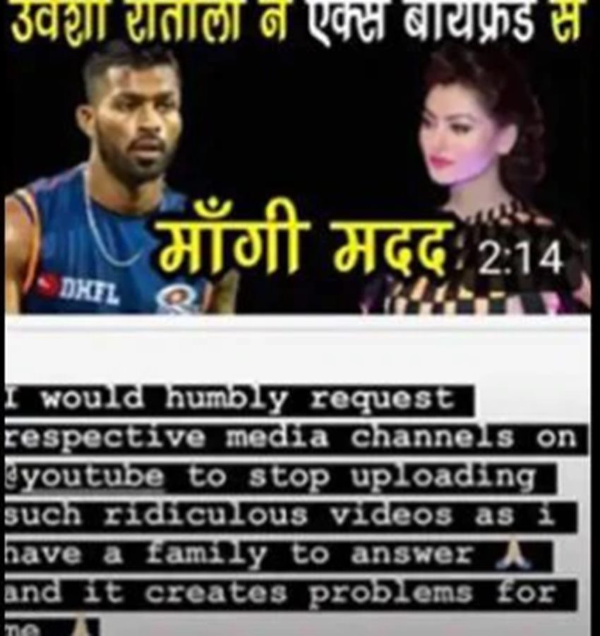 Urvashi Rautela On Hardik Pandya: बॉलीवुड एक्ट्रेस उर्वशी रौतेला अपने हालिया एक पोस्ट को लेकर काफी चर्चा में हैं। पोस्ट में वह हार्दिक पांड्या के साथ उनके नाम जोड़ने और उनसे मदद मांगने की खबरों को लेकर अपनी भड़ास निकाली हैं। दरअसल उर्वशी ने अपने इंस्टाग्राम अकाउंट पर एक स्क्रिन शॉट शेयर किया जिसमें लिखा था- उर्वशी रौतेला ने एक्स बॉयफ्रेंड से मांगी मदद। इस स्क्रिन शॉट को शेयर करते हुए उर्वशी ने लिखा, ‘मैं रिक्वेस्ट करती हूं कि इस वीडियो के लिए जिम्मेदार मीडिया चैनल प्लीज यूट्यूब पर ऐसे वीडियो अपलोड ना करें। मेरी एक फैमिली है जिसे मुझे जवाब देना होता है और ये सब मेरे लिए दिक्कत करता है।’ उर्वशी के इस बात की चर्च सोशल मीडिया पर खूब हो रही है।