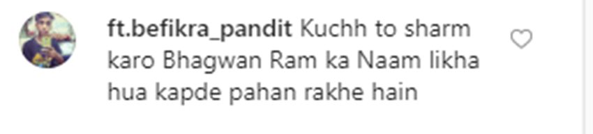 एक यूजर ने लिखा- ‘कुछ तो शर्म करो भगवान राम का नाम लिखे हुए कपड़े पहन रखे हैं।’ एक अन्य यूजर ने कमेंट में लिखा- मैंने आज तक किसी भी पिक पर कमेंट नहीं किया है। ना ही मैं आपको ट्रोल कर रहा हूं। लेकिन मैम प्लीज हमारे धर्म का इस तरह मजाक ना बनाएं।