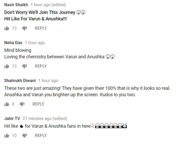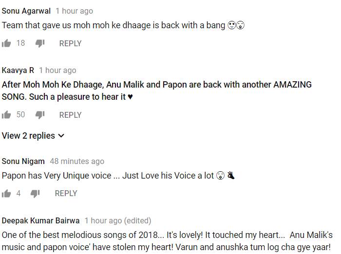एक फैन ने लिखा- क्या खूबसूरत गाना है, मैं गाने को देखने के बाद लगातार हंस रहा था वरुण धवन और अनुष्का शर्मा छा गए यार। वहीं एक अन्य फैन ने लिखा- जिस टीम ने हमें मोह मोह के धागे गाना दिया एक बार फिर से वापस आ गई। एक फैन लिखता है- साल 2018 का सबसे खूबसूरत गाना। यह प्यारा है और दिल को छू जाने वाला। पापोन और अनु मलिक ने मेरा दिल चुरा लिया। अनुष्का और वरुण आप दोनों ने छा गए यार। एक फैन ने स्टार्स की एक्टिंग की तारीफ करते हुए लिखा- एक मिडिल क्लास कपल की तरह दिख रहे हैं दोनों, वरुण धवन ने पहली बार कुछ हट कर किया है।