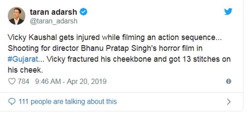 Vicky Kaushal Accident: बॉलीवुड एक्टर विक्की कौशल एक दुर्घटना में बुरी तरह के घायल हो गए हैं। गुजरात में एक फिल्म की शूटिंग के दौरान उनके चेहरे पर गंभीर चोटें आई हैं। खबरों के मुताबिक, विक्की कौशल एक एक्शन सीन की शूटिंग कर रहे हैं, उस वक्त यह हादसा हुआ। इस बात की जानकारी ट्रेड एनालिस्ट तरण आदर्श ने अपने वैरिफाइड ट्विटर हैंडल से ट्वीट कर दी है। तरण के मुताबिक, भानु प्रताप सिंह के निर्देशन में बन रही एक फिल्म की शूटिंग के दौरान विक्की कौशल के चेहरे पर चोट लगी है। जिसके चलते उन्हें 13 टांके आए हैं।