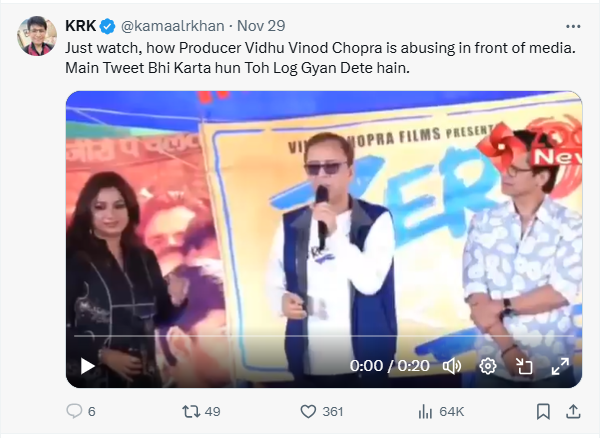 केआरके ने विधु विनोद चोपड़ा का वीडियो ट्विटर पर शेयर किया है। कैप्शन में केआरके ने लिखा, “अभी, प्रोड्यूसर विधु विनोद चोपड़ा का वीडियो देखा।, जिसमें वो मीडिया के सामने गाली दे रहे हैं। मैं ट्वीट भी करता हूं तो लोग ज्ञान देते हैं।”