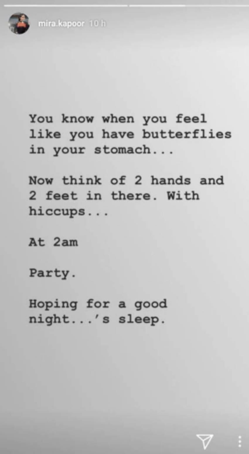 शाहिद कपूर की पत्नी मीरा राजपूत दूसरी बार मां बनने जा रही हैं। पिछले कुछ वक्त से वह सोशल मीडिया पर प्रेग्नेंसी के दौरान की तस्वीरें शेयर कर रही हैं। मीरा अपना ज्यादा से ज्यादा वक्त सोशल मीडिया पर ही बिताती हैं, यही कारण है कि वह अक्सर अपने पोस्ट के जरिए अपने मूड के बारे में अपने फैन्स को बताती रहती हैं। अब उन्होंने रात के 2 बजे इंस्टाग्राम स्टोरी पर अपने अनुभव साझा किए हैं।