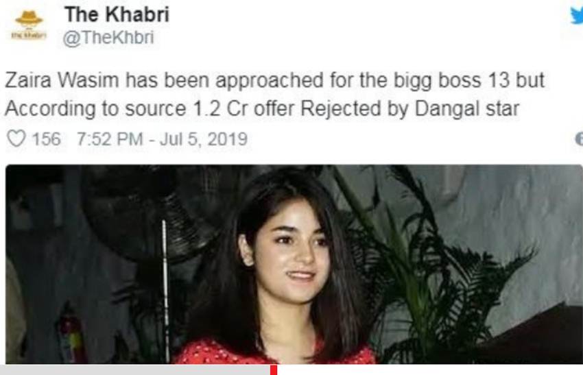 द खबरी के ट्वीट के मुताबिक, जायरा वसीम को बिग बॉस-13 के लिए अप्रोच किया गया था। इसके लिए उन्हें 1.2 करोड़ रुपए की फीस का भी ऑफर मिला था। हालांकि जायरा ने इस ऑफर को मना कर शो का हिस्सा बनने से इंकार कर दिया है।