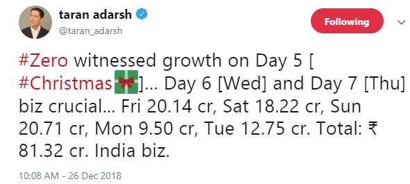 तरण आदर्श ने अपने ट्विटर अकाउंट से एक पोस्ट किया, इस पोस्ट में तरण ने फिल्म जीरो की कमाई के आंकड़े शेयर किए...