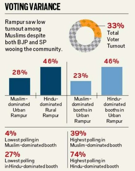 रामपुर शहरी के 90 से अधिक मतदान केंद्र, जहां 20% से कम मतदान हुआ, वह सभी मुसलमानों के वर्चस्व वाले हैं। यहां तक कि सपा के गढ़, जहां पार्टी का कार्यालय है, वहां के 17 मतदान केंद्रों पर मतदान केवल 24% हुआ है। रामपुर शहरी के केवल एक मुस्लिम बहुल मतदान केंद्र सराय गेट घोसियान पर सबसे अधिक 39% मतदान दर्ज किया गया है।