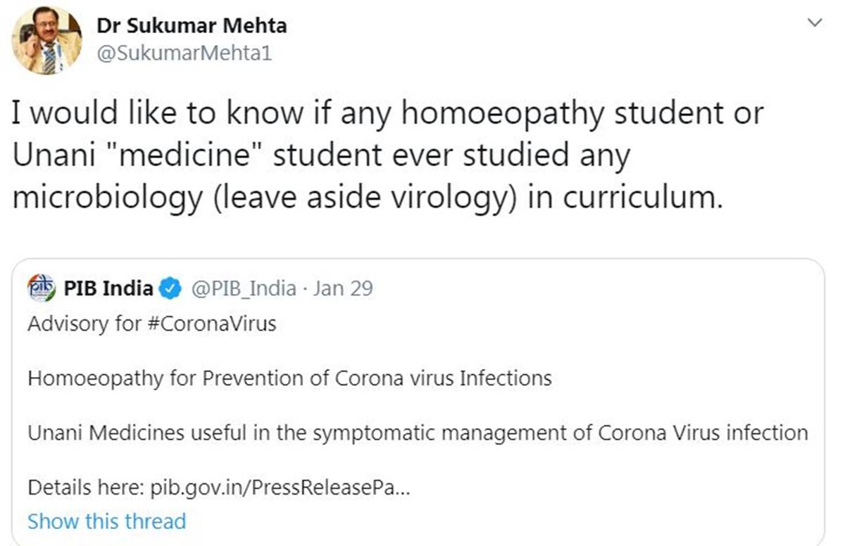 कोरोना वायरस के खतरे को भांपते हुए आयुष मंत्रालय द्वारा जारी होम्योपैथिक और आयुर्वेदिक दवाओं की एडवाइजरी पर लोग भड़क रहे हैं। ट्वीटर पर लोग तरह तरह के सवाल कर रहे हैं। एक यूजर ने लिखा, ”मैं यह जानना चाहता हूं कि क्या होम्योपैथी और यूनानी के स्टूडेंट ने माइक्रोबायोलोजी पढ़ी है?”