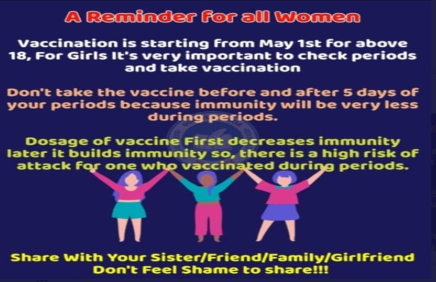 Covid Vaccine Side Effects: पिछले दिनों सोशल मीडिया खासकर वाट्सऐप पर एक फोटो धड़ल्ले से शेयर की जा रही है जिसके अनुसार युवतियों को वैक्सीन लेने से पहले अपने माहवारी के तारीखों को ध्यान में रखना चाहिए। इस फोटो में लिखा है कि पीरियड्स के दौरान इम्युनिटी बेहद कमजोर होती है, ऐसे में माहवारी से 5 दिन पहले और बाद तक टीका लगाने से लड़कियों को बचना चाहिए। किसी भी बीमारी या महामारी के साथ फैलती है अफवाहें जिससे बचना बेहद जरूरी है। आइए जानते हैं कि इस विषय को लेकर विशेषज्ञों का क्या कहना है –