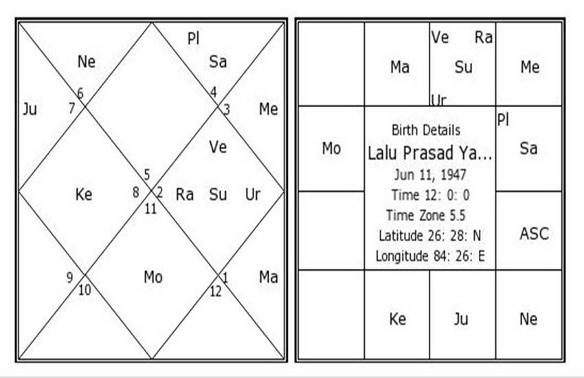 बिहार के पूर्व मुख्यमंत्री और राष्ट्रीय जनता दल के सुप्रीमों लालू यादव का जन्म 11 जून, 1947 है। यदि इनका जन्म समय दिन का मध्यकाल मान लिया जाए, और यदि उनका यह जन्म विवरण सत्य है तो मुसीबत में पड़े बिहार के इस कद्दावर नेता कि जन्म कुंडली इस प्रकार है-