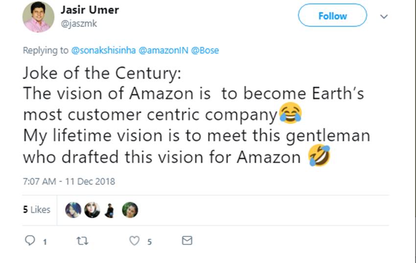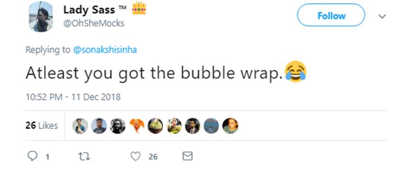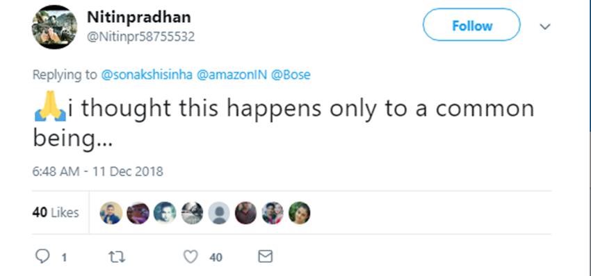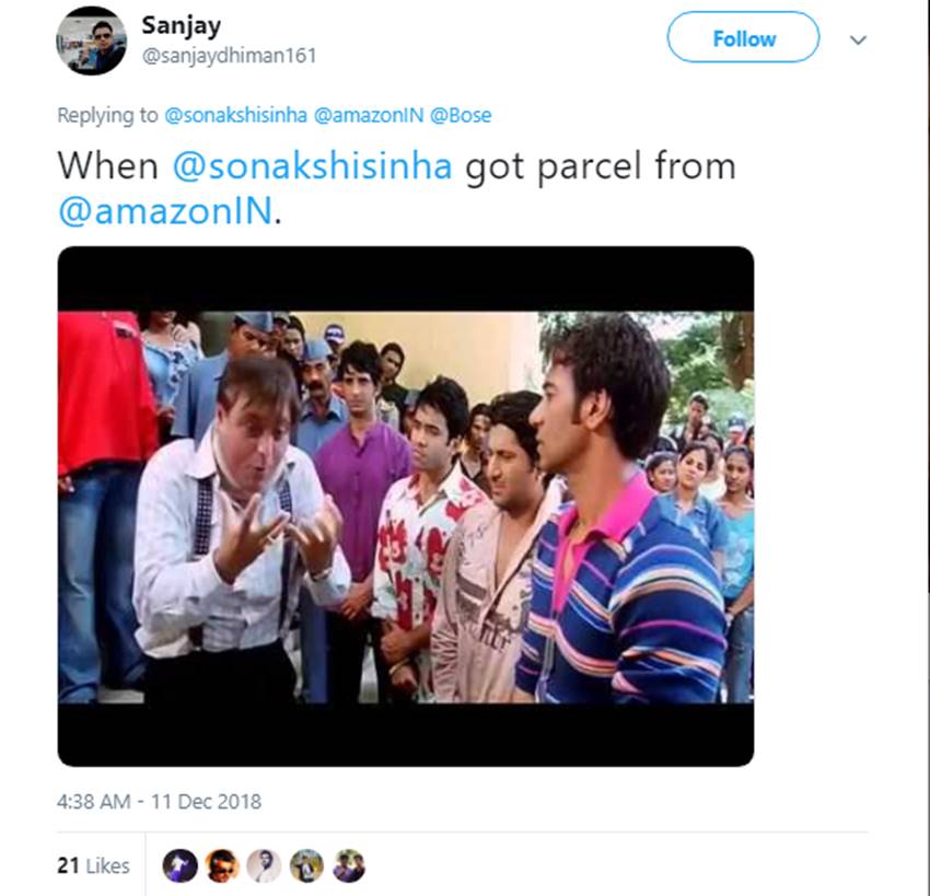 अभिनेत्री ने ट्वीट कर लिखा कि ‘हाय अमेजॉन, मैंने Bose इयरफोन ऑर्डर किया था लेकिन देखिए मुझे इसकी जगह पर क्या मिला? यह अच्छी तरह से पैक किया हुआ था। अच्छा दिख रहा था लेकिन सिर्फ बाहर से। इसके अंदर सिर्फ एक लोहे का छोटा सा टुकड़ा है और आपकी ग्राहक सेवा सर्विस कोई मदद नहीं करना चाहती।’ जल्दी ही सोनाक्षी सिन्हा के इस ट्वीट पर लोगों की नजर पड़ गई। कई लोगों ने अमेजॉन की इस खराब सर्विस की निंदा की है तो कई लोग बड़ी हस्ती के साथ ऐसा होने पर मजे भी लेने लगे।
