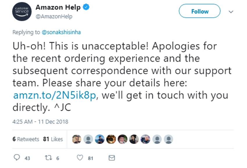 जल्दी ही अमेजॉन ने भी इसपर अपनी प्रतिक्रिया दी। कंपनी ने अपनी गलती मानते हुए अभिनेत्री की मदद करने की बात कही।