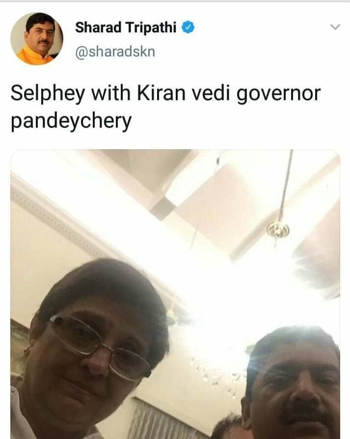 अब सोशल मीडिया पर एक ट्वीट का स्क्रीनशॉट वायरल हो रहा है। ये ट्वीट बीजेपी सांसद शरद त्रिपाठी का बताया जा रहा है। इस ट्वीट के वायरल होने के पीछे एक मजेदार कारण है। दरअसल इस ट्वीट में एक तस्वीर है। इस तस्वीर में शरद त्रिपाठी और पुड्डुचेरी की गवर्नर किरन बेदी दिख रही हैं। तस्वीर के साथ कैप्शन में लिखा गया है – Selphey with Kiran vedi governer pandechery.