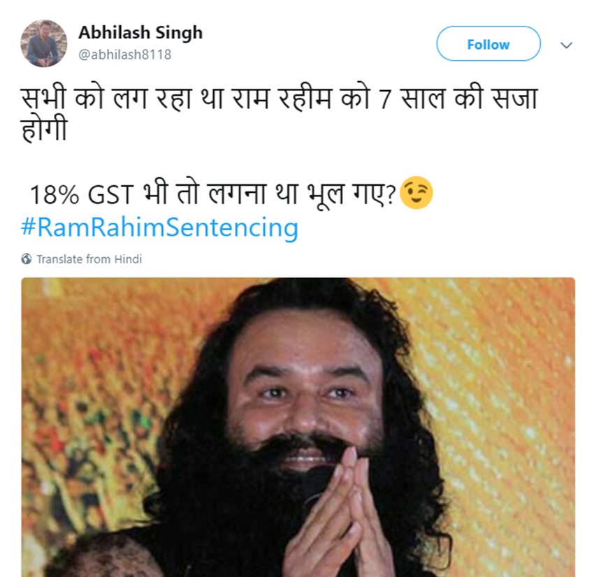 सोमवार को सजा का ऐलान होने के बाद बलात्कारी बाबा राम रहीम सिंह सोशल मीडिया ट्विटर ट्रेंड करने लगे। जहां कई लोग इस फैसले को सही बताते हुए भारत की न्याय व्यवस्था की तारीफ कर रहे हैं और वहीं कुछ लोग उनकी सजा को कम बता रहे थें। कुछ लोग ऐसे भी थे जो कि सोशल मीडिया पर बलात्कारी बाबा का मजाक उड़ा रहे थे। एक सोशल मीडिया यूजर ने लिखा, ‘डेरा सच्चा सौदा में बाबा के लिए भर्ती निकली है। नियुक्ति दस साल के लिए होगी।’ वहीं एक अन्य यूजर ने लिखा है, ‘कुछ लोग सोच रहे थे कि बाबा को 7 साल की सजा होगी, लेकिन वो ये भूल गए कि भाई जीएसटी भी तो लगेगी।’ ऐसे में हम आपके लिए लाए हैं कुछ ऐसे ही सोशल मीडिया पोस्ट, जिन्हें पढ़कर आप अपनी हंसी नहीं रोक पाएंगे।