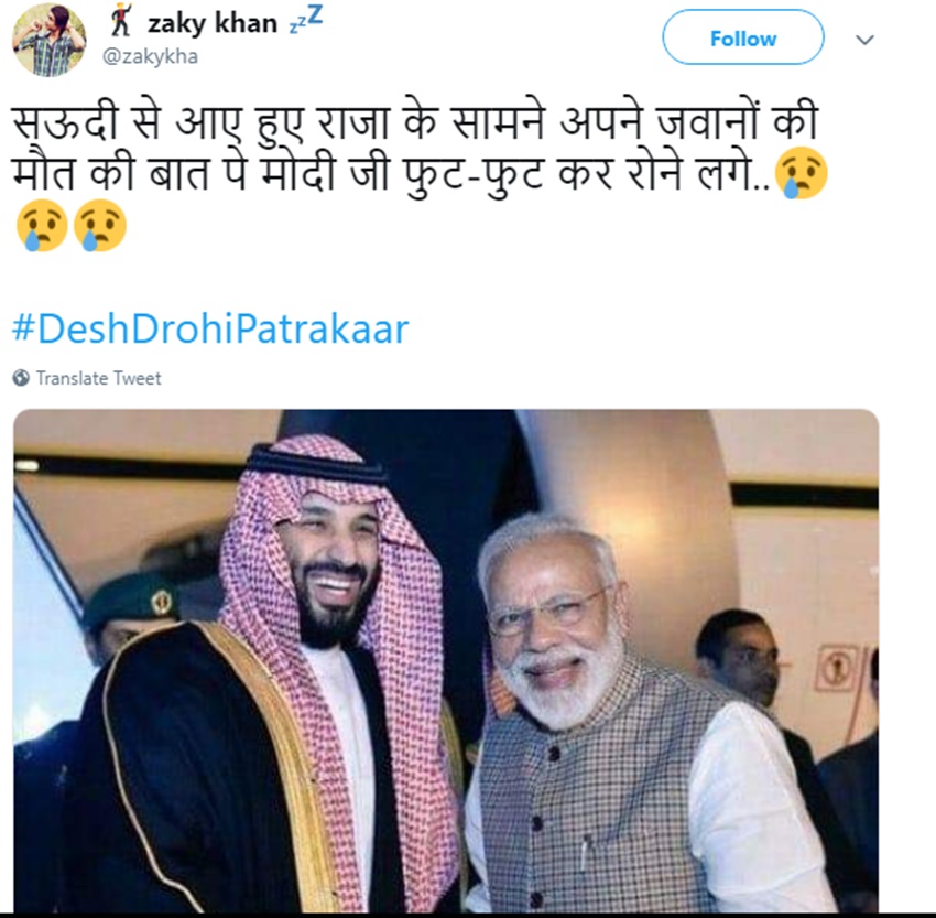Narendra Modi Mohammad Bin Salman meet: सऊदी अरब के प्रिंस मोहम्मद बिन सलमान बिन अब्दुल अजीज अल सऊद इन दिनों भारत में हैं। भारत आने से पहले मोहम्मद बिन पाकिस्तान भी गए थे और वहां उन्होंने पाकिस्तान को आर्थिक मदद की पेशकश भी की है। सलमान बिन जब बीते मंगलवार को भारत आए तो प्रधानमंत्री नरेंद्र मोदी ने एयरपोर्ट पर उनका गर्मजोशी से स्वागत किया। पीएम ने प्रोटोकॉल तोड़कर उन्हें गले भी लगाया। लेकिन देश में हुए पुलवामा अटैक के बाद लोगों में गुस्सा है और सोशल मीडिया पर कई लोग अपने गुस्से का इजहार भी कर रहे हैं। ट्विटर पर कई लोग इस बात को लेकर मजाक बना रहे हैं कि पाकिस्तान को आर्थिक मदद देने वाले सऊदी अरब के प्रिंस का पीएम हंस कर स्वागत कर रहे हैं।