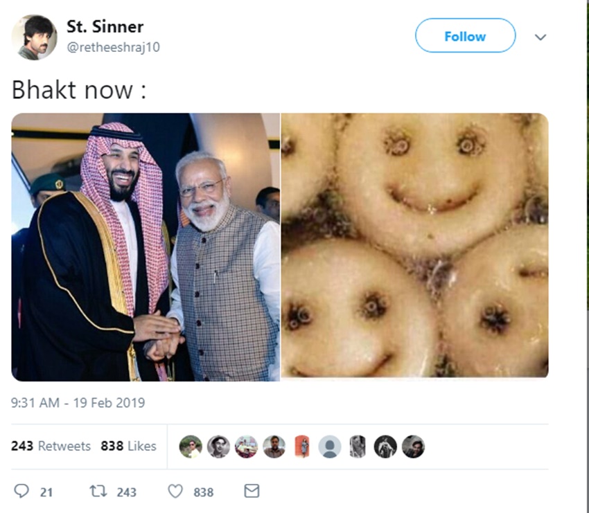 सऊदी अरब के प्रिंस और पीएम मोदी के मुलाकात की तस्वीरें सोशल मीडिया पर शेयर की जा रही हैं तथा कई तरह के जोक्स भी इसपर बनाए जा रहे हैं। लोगों के फनी कमेंट्स आपको भी हंसने पर मजबूर कर देंगे।