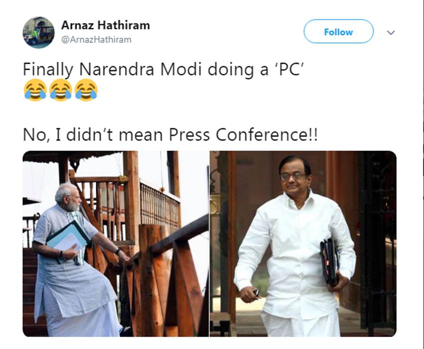एक यूजर ने तस्वीर शेयर करते हुए लिखा कि आखिरकार प्रधानमंत्री नरेंद्र मोदी पीसी कर ही रहे हैं। इस यूजर ने ये भी लिखा कि पीसी मतलब प्रेस कॉन्फ्रेंस नहीं बल्कि पी चिदम्बरम। इस यूजर ने पीएम की तस्वीर के साथ पी चिदम्बरम की तस्वीर भी शेर की।
