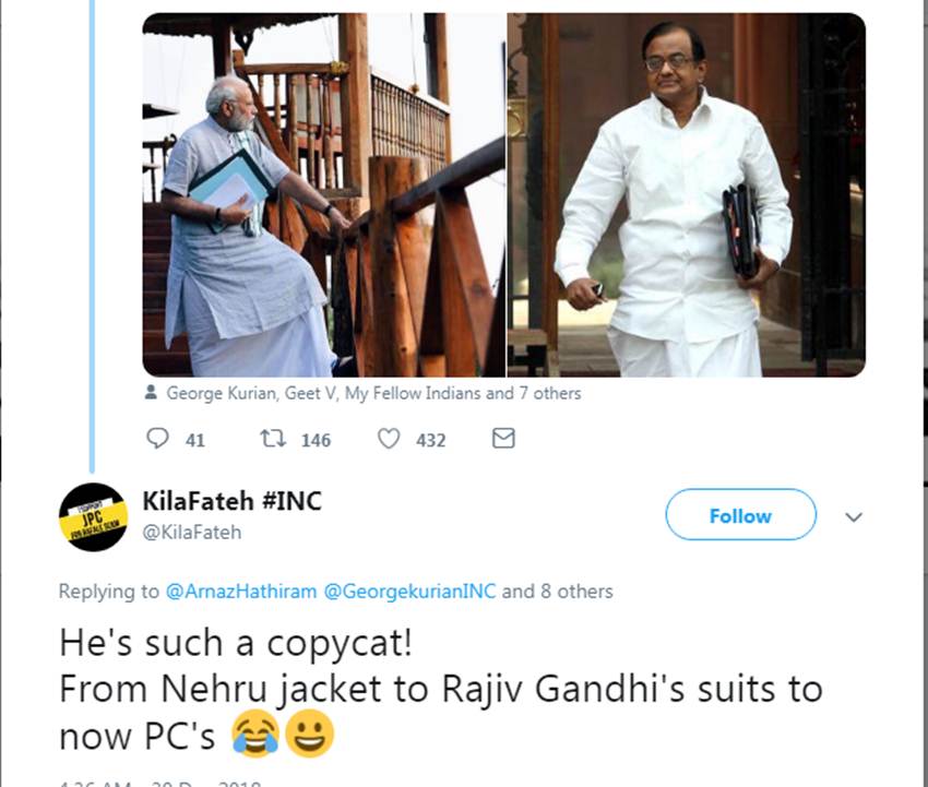 पीएम मोदी के नए लुक पर दूसरे यूजर्स ने मजे लेते हुए लिखा कि, ‘पीएम कॉपी कैट हैं। नेहरू जैकेट से राजीव गांधी के सूट तक और अब पी चिदम्बरम का।’