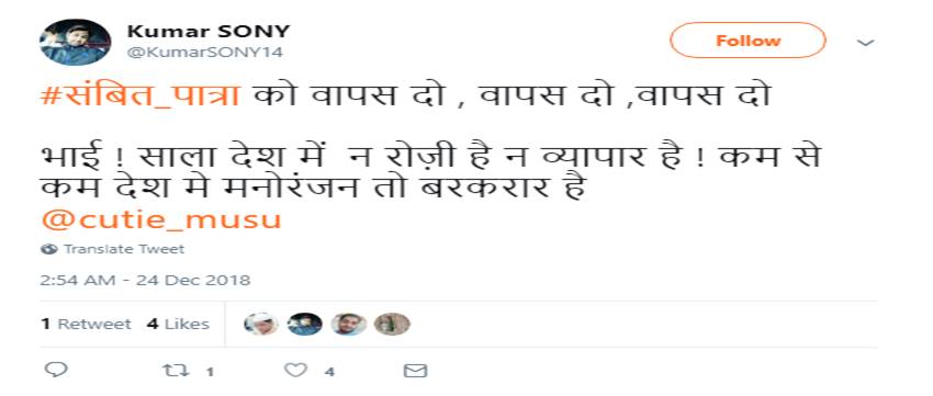 सोशल मीडिया पर भी भाजपा प्रवक्ता संबित पात्रा को लेकर खूब चर्चा होती रहती है। अब सोशल मीडिया पर अचानक यह चर्चा होने लगी है कि संबित पात्रा को भाजपा ने राष्ट्रीय प्रवक्ता के पद से हटा दिया है। हालांकि अभी तक ऐसी कोई ख़बर किसी भी मीडिया रिपोर्ट में नहीं आई है और ना ही पार्टी की तरफ से ऐसी कोई भी बात कही गई है। लेकिन सोशल मीडिया पर संबित पात्रा को प्रवक्ता पद से हटाए जाने को लेकर चल रही चर्चा के दौरान तरह-तरह की फनी प्रतिक्रियाएं जरुर सामने आ रही हैं।