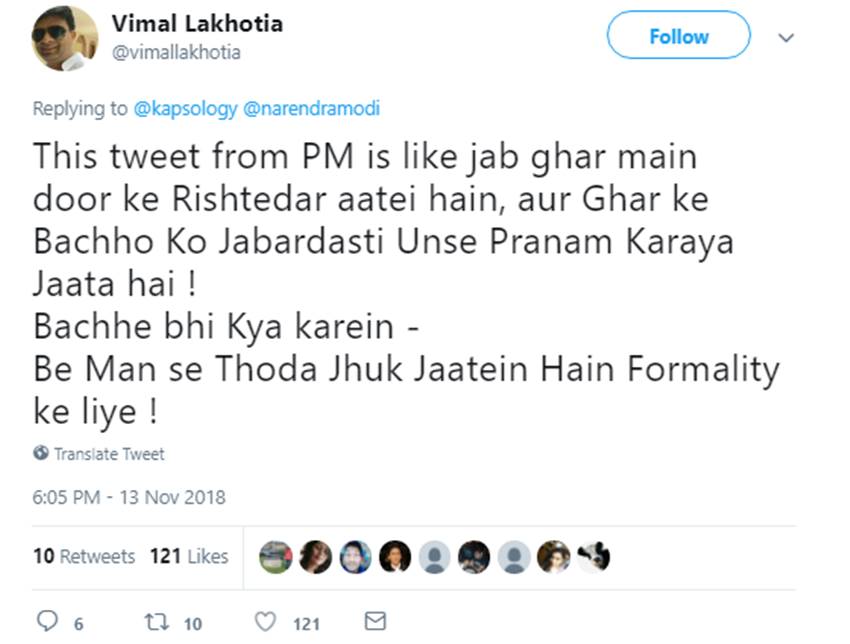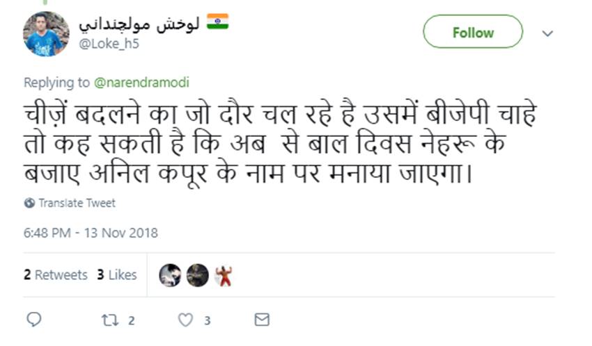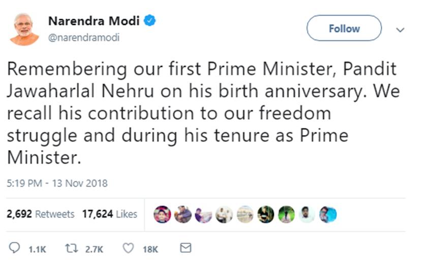 देश के मौजूदा प्रधानमंत्री नरेंद्र मोदी ने भी पंडित नेहरू को इस मौके पर याद किया। पीएम मोदी ने ट्वीट करते हुए लिखा कि ‘हमारे पहले प्रधानमंत्री पंडित जवाहर लाल नेहरू को उनके जन्मदिवस के मौके पर याद कर रहा हूं। देश की आजादी की लड़ाई में उनका योगदान और प्रधानमंत्री के तौर पर उनका कार्यकाल हम सभी याद कर रहे हैं।’ प्रधानमंत्री के इस ट्वीट के बाद कई यूजर्स ने इसपर अपनी प्रतिक्रिया दी है। कई यूजर्स पीएम मोदी के इस ट्वीट को पढ़ने के बाद इसपर मजे ले रहे हैं।