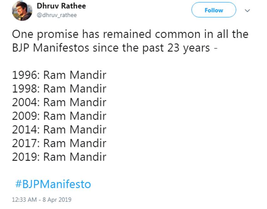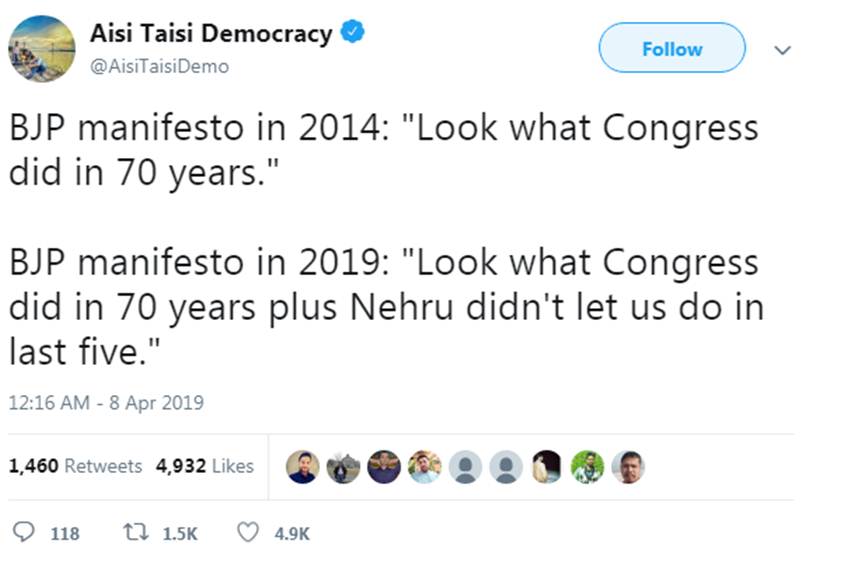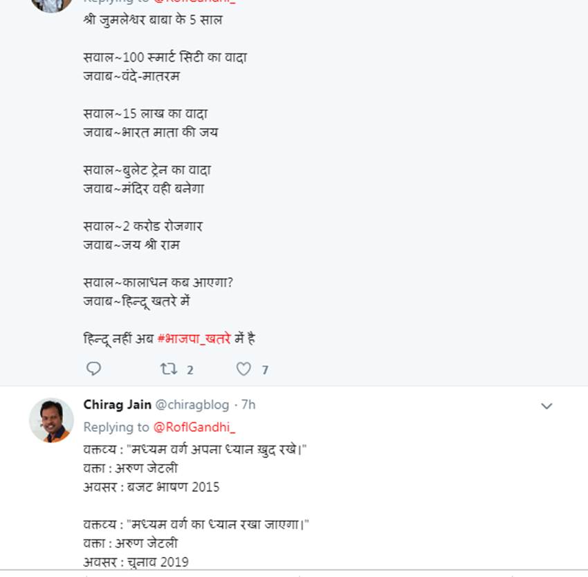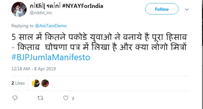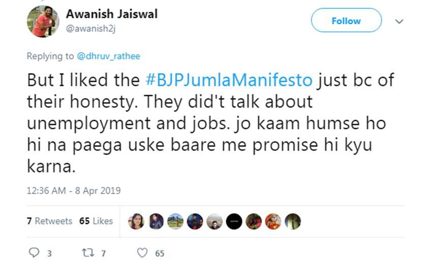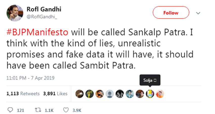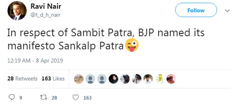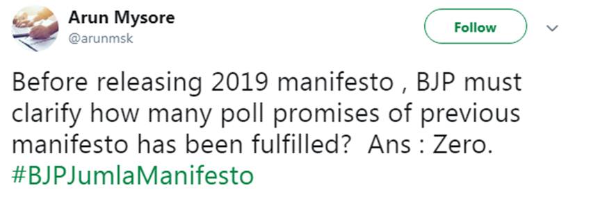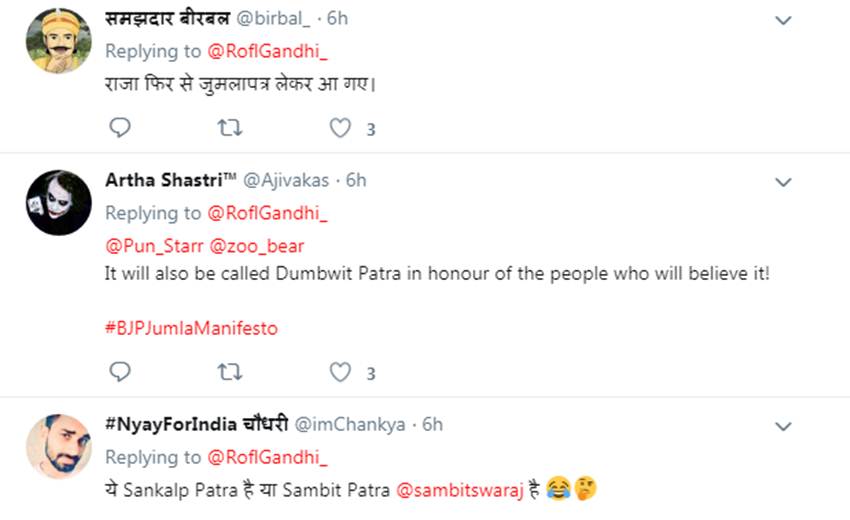 एक यूजर ने संकल्प पत्र के बारे में लिखा है कि ‘संबित पात्रा के सम्मान में भाजपा को अपने मैनिफेस्टो का नाम संकल्प पात्रा रखना चाहिए था।’ एक अन्य यूजर ने लिखा कि ‘भाजपा के मैनिफेस्टो में है कि देखो 70 सालों में कांग्रेस ने क्या किया और पिछले पांच साल में नेहरु ने हमे कुछ नहीं करने दिया।’ अरुण नाम के एक यूजर ने तो इसपर गंभीर सवाल उठाते हुए यह भी लिखा है कि ‘भाजपा को यह बताना चाहिए कि उसने पिछले मैनिफेस्टो में किए गए कितने वादों को पूरा किया है।’