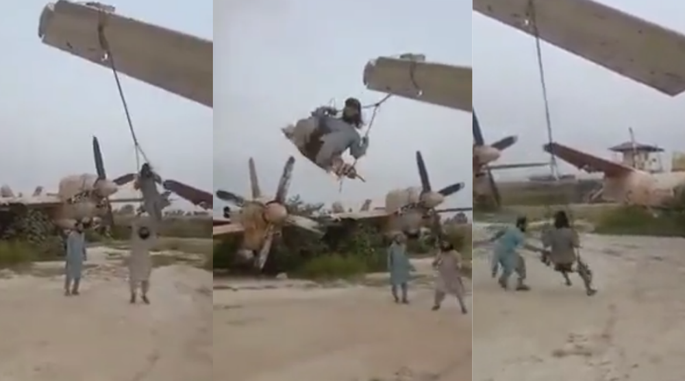 49 सेकेंड का जो वीडियो उन्होंने साझा किया, उसमें खटारा प्लेन के पर में मोटी रस्सी बांधकर जुगाड़ू झूला बनाया गया था। एक लड़ाका उस पर बैठकर आनंद ले रहा था, जबकि दो तालिबानी उसे पीछे से धक्का दे उसे और आनंद दिलाने का प्रयास कर रहे थे।