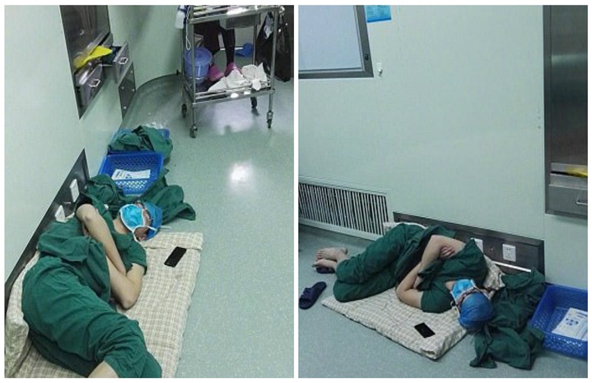 चीन के अखबार पीपुल्स डेली के सोशल मीडिया अकाउंट के मुताबिक ये तस्वीरें चीन के अनहुई प्रांत के डिंगयुआन शहर के एक अस्पताल में ली गई है। इस डॉक्टर ने रात भर में लोगों की सर्जरी की थी, उसके अगले सुबह भी इसने 3 लोगों का ऑपरेशन किया, जब ये काम पूरा हुआ तो इस डॉक्टर को काम शुरू किये 28 घंटे गुजर चुके थे। इसके बाद थका-हारा डॉक्टर ऑपरेशन थियेटर के बाहर ही फर्श पर मरीजों वाला बिस्तर बिछाया और उसी पर सो गया।