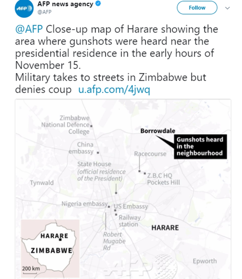जिम्बाब्वे की सेना का कहना है कि राष्ट्रपति मुगाबे और उनकी पत्नी बिल्कुल सुरक्षित हैं और वे उनकी हिरासत में हैं। सेना सरकारी दफ्तरों और सड़कों के आसपास पैट्रोलिंग कर रही है। देश के उपराष्ट्रपति इमरसन मनंगावा के बर्खास्त किए जाने के बाद सेना ने मुगाबे को चुनौती दी थी। वहीं, दक्षिण अफ्रीका के राष्ट्रपति जैकब जुमा ने जिम्बाब्वे की सरकार और सुरक्षा बलों से अपील की है वे देश के हालात को जल्द से जल्द पटरी पर ले आएं।