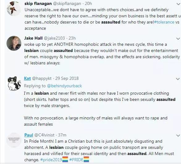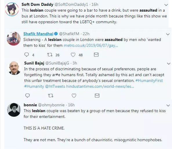 लंदन में एक डबल-डेकर बस में एक लेस्बियन कपल पर हुए हमले के खिलाफ सोशल मीडिया तीखा विरोध दर्ज कराया गया है। बस में कपल द्वारा एक दूसरे को चूमने से इनकार करने पर अपराधियों ने दोनों पर हमला कर दिया। लूटपाट की वारदात को भी अंजाम दिया गया। अपराधी मारपीट की घटना को अंजाम देने के बाद दोनों से फोन और बैग छीनकर ले गए।