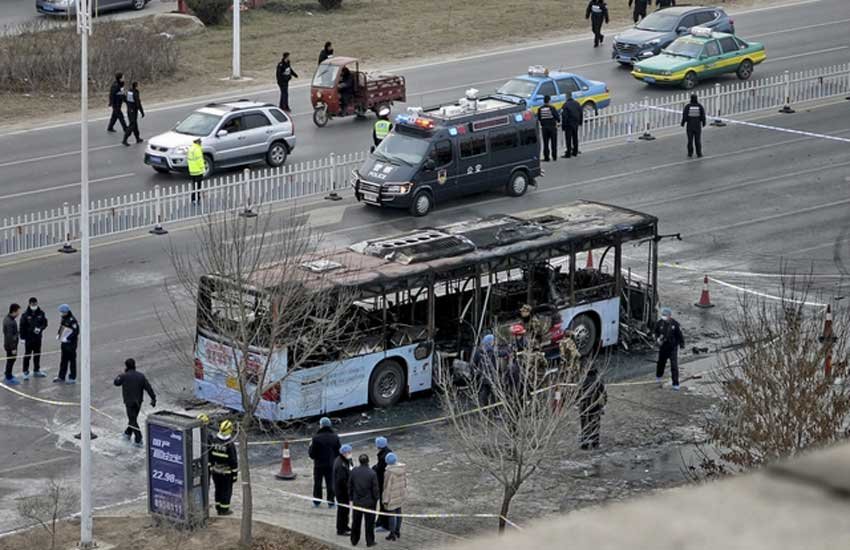 पूर्वोत्तर चीन में सड़कों पर वाहनों की भारी भीड़ के समय मंगलवार सुबह एक बस पर हमला करके उसमें आग लगा दी गई। इस घटना में 14 लोगों की मौत हो गई और 32 अन्य लोग घायल हो गए। निंगशिया हुई स्वायत्त क्षेत्र में बस में आग लगाने वाले संदिग्ध मा योंगपिंग की तलाश के लिए जन सुरक्षा के निंगशिया क्षेत्रीय विभाग ने एक तलाशी अभियान शुरू किया है। यिनचुआन शहर की हेलान काउंटी में एक फर्नीचर मॉल के निकट एक बस में स्थानीय समयानुसार सुबह करीब सात बजे आग लगाई गई। अधिकारियों ने बताया कि इस दौरान 14 लोगों की मौत हो गई और 32 अन्य लोग घायल हो गए। इलाके को घेर लिया गया है। घायलों का अस्पतालों में दाखिल कराया गया है।
