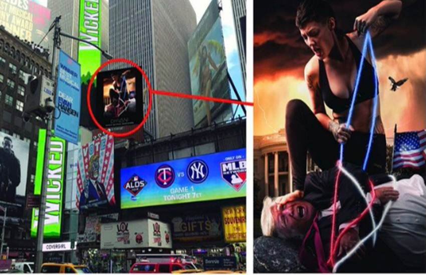 अमेरिका के न्यूयॉर्क शहर के प्रसिद्ध टाइम्स स्कवायर पर एक गारमेंट कंपनी का बिलबोर्ड चर्चा का विषय बना हुआ है। दरअसल इस बिलबोर्ड में एक मॉडल अमेरिकी राष्ट्रपति डोनाल्ड ट्रंप के चेहरे पर पांव रखकर खड़ी है। इस बिलबोर्ड को लेकर डोनाल्ड ट्रंप के बेटे डोनाल्ड ट्रंप जूनियर ने कड़ी नाराजगी जतायी है और अपने देश के मीडिया संस्थानों की आलोचना की है। खबर के अनुसार, यह बिलबोर्ड अमेरिका के पोर्टलैंड में स्थित गारमेंट कंपनी धवनी का बिलबोर्ड है, जिसे कंपनी ने विज्ञापन के लिए टाइम्स स्कवायर पर लगवाया है।