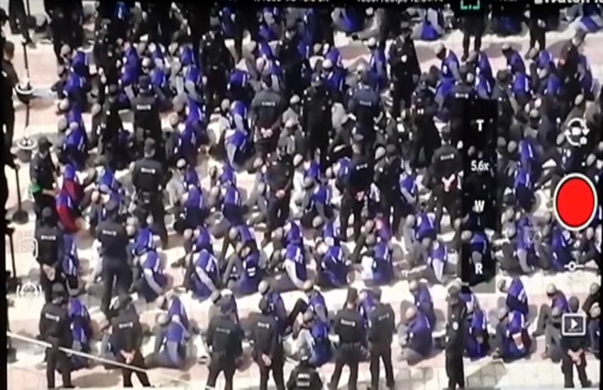 BREAKING! New leaked video shows up to 600 #Uyghur Muslim concentration camp detainees being moved shackled together, handcuffed, blindfolded and with their heads shaved. #Uyghurs #China #EastTurkestan #Xinjiang pic.twitter.com/dTx2y5sFzx