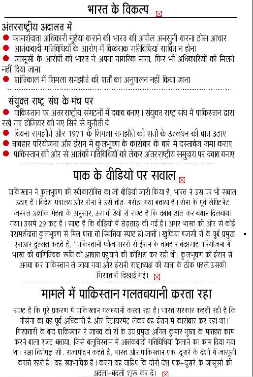 भारत और पाकिस्तान- दोनों ही देशों के नागरिक कानून जासूसी के मामले में कई स्तर पर खामोश हैं। वियना सम्मेलन की धारा 36(1) की उपधारा (बी) के अनुसार, जासूसी या आतंकवादी गतिविधियों का आरोपी जिस देश का नागरिक हो, उसके लिए वकील वही देश मुहैया कराएगा। साथ ही, आरोपी से मिलने की पूरी छूट होगी। भारत ने कुलभूषण को अपना नागरिक मान लिया था, इस नाते विदेश मंत्रालय के अधिकारियों ने 11 बाद पाकिस्तानी शासन को ‘परामर्शदाता अधिकारी’ मुहैया कराने और उसके साथ मुलाकात करने का आवेदन भेजा। पाकिस्तान-अफगानिस्तान-ईरान डेस्क के प्रभारी रहे वरिष्ठ नौकरशाह और पूर्व आईएफएस अधिकारी विवेक काटजू ने ‘जनसत्ता’ से कहा, ‘अंतरराष्ट्रीय कानून के हिसाब से गिरफ्तारी की जानकारी देनी होगी। साथ ही, आरोपी नागरिक तो तीन सहूलियतें देनी जरूरी हैं- 1.परामर्शदाता अधिकारी को अधिकार होगा कि उसके नागरिक को जिस मुल्क ने पकड़ा है, वहां के लोगों से वह खुल कर बातचीत करे। 2. जब भी आरोपी चाहे, उसे परामर्शदाता अधिकारी से मिलने की इजाजत होगी और 3. परामर्शदाता अधिकारी उससे जब चाहे मिल सकता है और कानूनी प्रतिनिधि नियुक्त कर सकता है।’