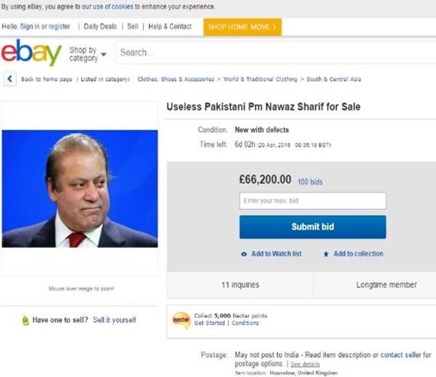पाकिस्तान के प्रधानमंत्री नवाज शरीफ की ऑनलाइन शॉपिंग वेबसाइट ईबे पर बोली लग रही है। एक अज्ञात यूजर ने शरीफ…