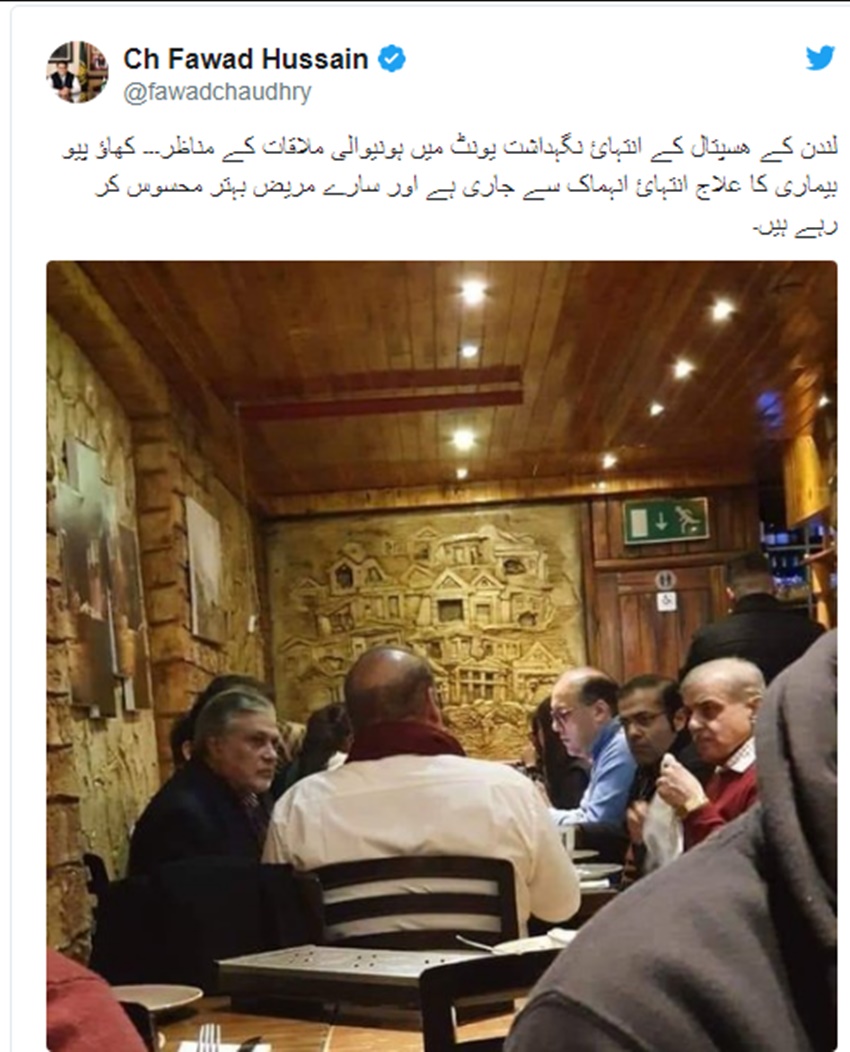 लंदन के होटल में नवाज शरीफ की जो तस्वीरें वायरल हुई हैं उसमें वो PML-N के अध्यक्ष शाहबाज शरीफ और उनके बेटे हमजा के साथ बैठे दिखाई दे रहे हैं। पाकिस्तान के मंत्री फवाद चौधरी ने इस तस्वीर को अपने ट्विटर अकाउंट पर अपलोड किया है। यह तस्वीर सामने आने के बाद पाकिस्तान के प्रधानमंत्री इमरान खान ने भी इसपर अपनी प्रतिक्रिया दी है। इमरान खान ने कहा कि ‘चिकित्सकों ने अपनी राय दी थी कि अगर इन्हें (नवाज शरीफ) इलाज के लिए तुरंत विदेश नहीं भेजा गया तो किसी भी पल इनकी मौत हो सकती है। लेकिन अचानक वो बेहतर दिख रहे हैं।’