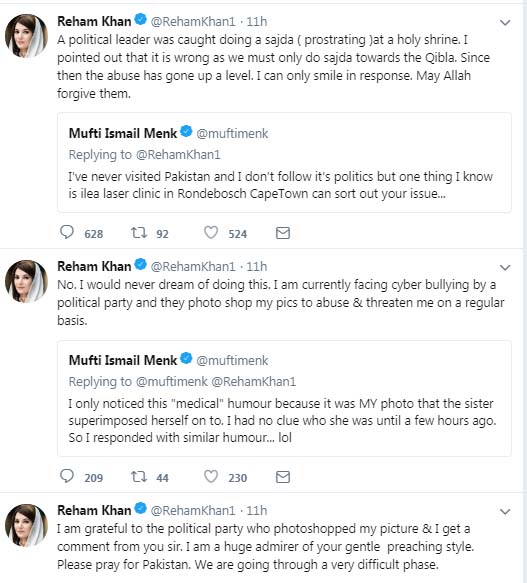 हालांकि पूर्व पत्रकार रेहम खान ने कहा कि उनके तंज को गलत समझ लिया गया। उन्होंने लिखा, “मेरे ब्रिटिश ह्यूमर को गलत समझ लिया गया, मेरे घर में कुछ ही लोग हैं जो दाढ़ी नहीं रखते हैं, मैं अपने उम्र और हॉर्मोन के बारे में जोक कर रही थी, ये एक तरह का मेडिकल जोक था।” इसके बाद रेहम खान ने मुफ्ती को पूरा मामला विस्तार से ट्वीट कर समझाया। रेहम खान ने कहा कि, “कुछ दिन पहले पाकिस्तान का एक नेता एक दरगाह पर सजदा करते हुए रिकॉर्ड कर लिया गया था। मैंने उसे याद दिलाया कि हमें सिर्फ किबला की ओर ही सजदा करनी चाहिए, इसके बाद मुझे सोशल मीडिया पर प्रताड़ित किया जा रहा है, इसके जवाब में मैं सिर्फ हंस सकती हूं और कह सकती हूं कि अल्लाह उन्हें माफ करें।”