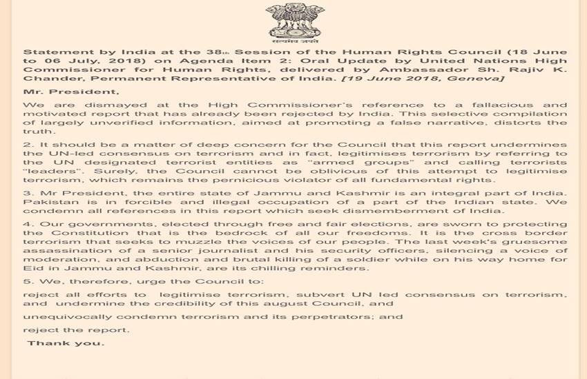 भारत ने रिपोर्ट पर जताया कड़ा ऐतराज: इस रिपोर्ट के सामने आने के बाद विदेश मंत्रालय ने इसपर कड़ा एतराज जताया था। भारत ने यूनाइटेड नेशन की रिपोर्ट को गलत और बहकाने वाला बतलाया था। भारत की तरफ से कहा गया था कि जम्मू-कश्मीर भारत का अभिन्न अंग है और हम किसी बाहरी की दखलअंदाजी बर्दाशत नहीं है। भारत ने इस रिपोर्ट को खारिज करते हुए कहा था कि यह भ्रामक, पक्षपातपूर्ण और प्रेरित है।