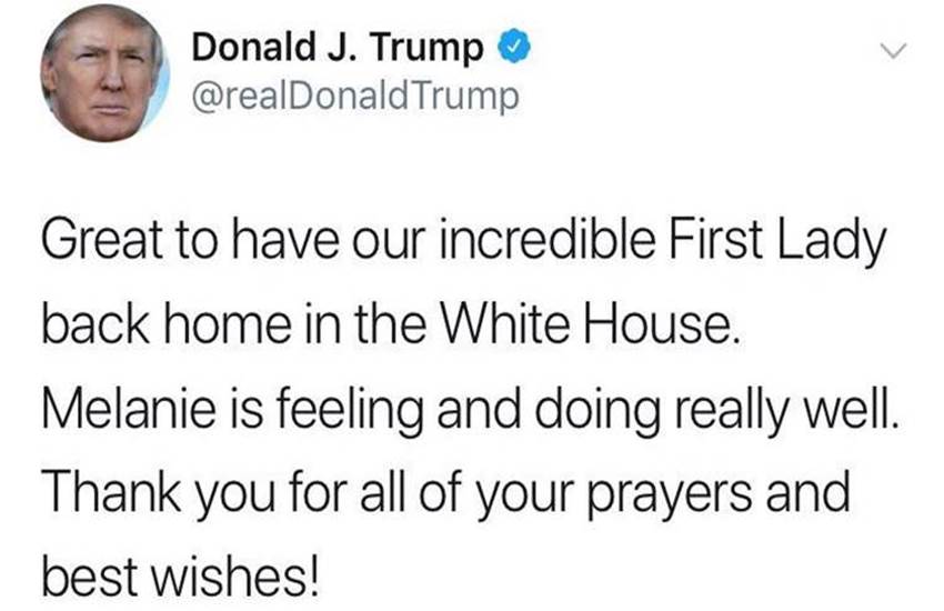 Great to have our incredible First Lady back home in the White House. Melania is feeling and doing really well. Thank you for all of your prayers and best wishes!