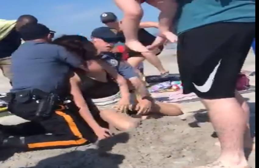 न्यू जर्सी में कुछ पुलिसवालों ने beach (बालू-तट) पर सो रही एक युवती की पहले पिटाई की और फिर उसे गिरफ्तार कर लिया। महिला के सिर पर मुक्कों से पिटाई का एक वीडियो भी वायरल हुआ है। एलेक्स हेविट नाम की एक महिला ने इस पूरी घटना को वीडियो उस वक्त बनाया जब वो समुद्र किनारे बालू-तट (beach) पर आराम कर रही थीं। इस वीडियो में नजर आ रहा कि अचानक कुछ पुलिसवाले एक युवती पर हमला बोल देते हैं। पुलिस वाले युवती की मुक्कों से पिटाई कर देते हैं। काफी देर तक युवती और कुछ पुरुष पुलिसकर्मियों के बीच खींचतान चलती है। फिर पुलिस वाले इस महिला को हथकड़ी पहना कर अपने कब्जे में ले लेते हैं।